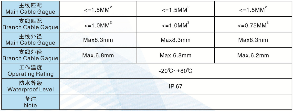 支線匹配(Branch Cable Gague):   <= 1.0MM2           <=1.0MM2            <=0.75MM2